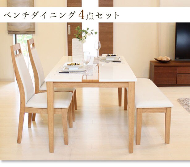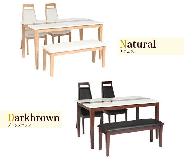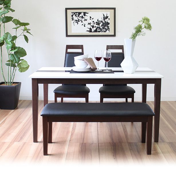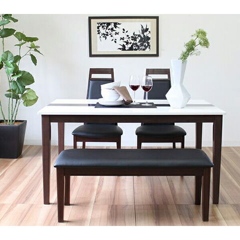 【素材】テーブル:天板/MDF(PU塗装)・脚/ラバーウッド チェア:張地/PVC・中材/ウレタン・合板・脚/ラバーウッド ベンチ:張地/PVC・中材/ウレタン・合板・脚/ラバーウッド 【商品サイズ】テーブル:幅135x奥行80x高さ70cm チェア: 幅45×奥行56×高さ97cm(座面高43) ベンチ: 幅104×奥行36×高さ43cm