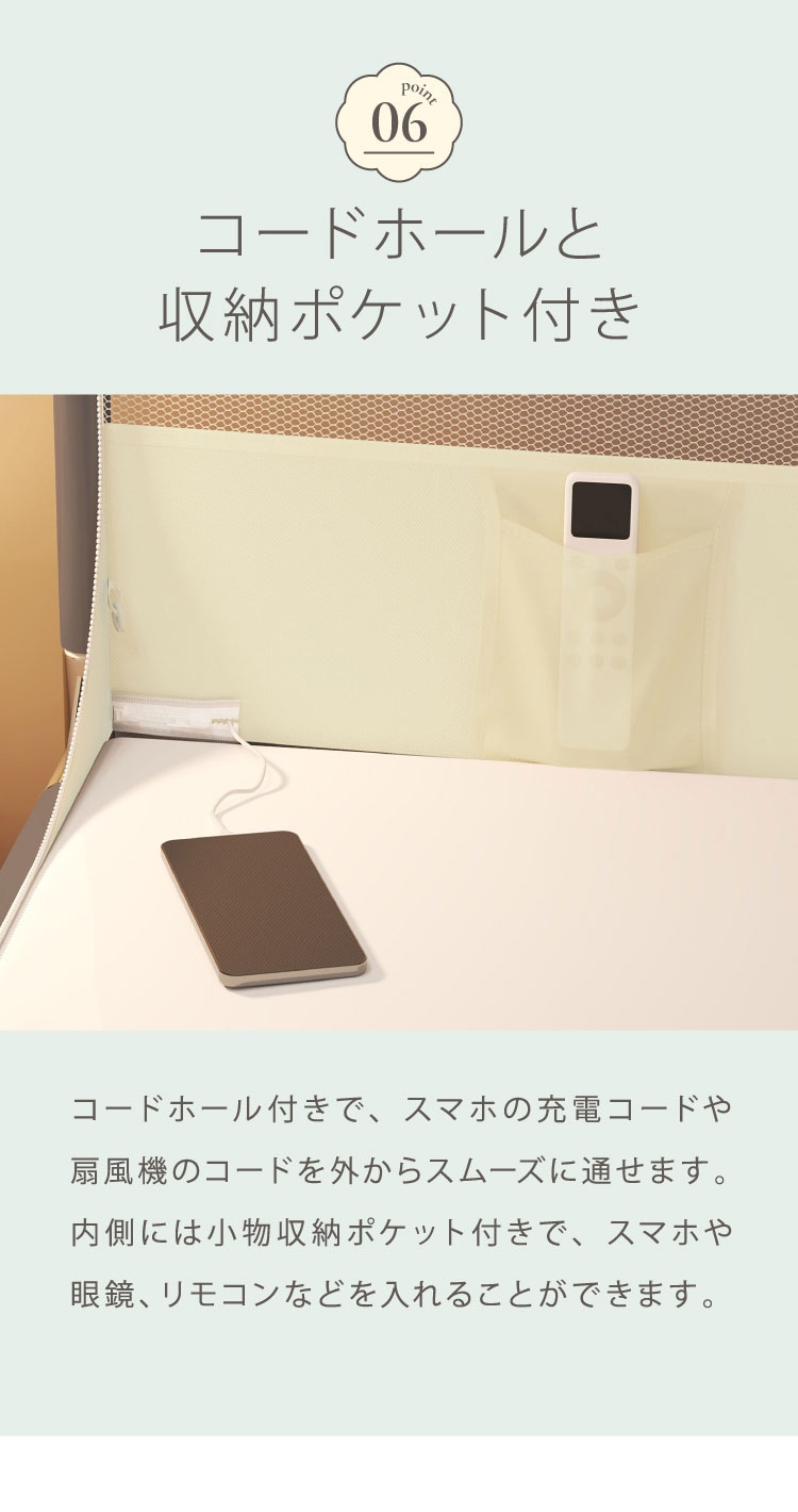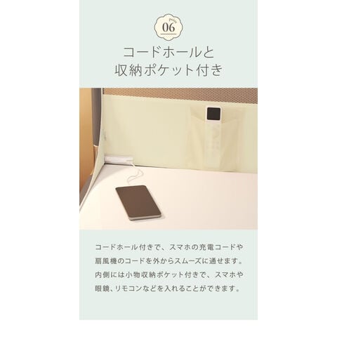 スマホの充電や小型扇風機に便利なコードホール付きで、内側にはスマホや眼鏡が入れられる収納ポケットも備えています。