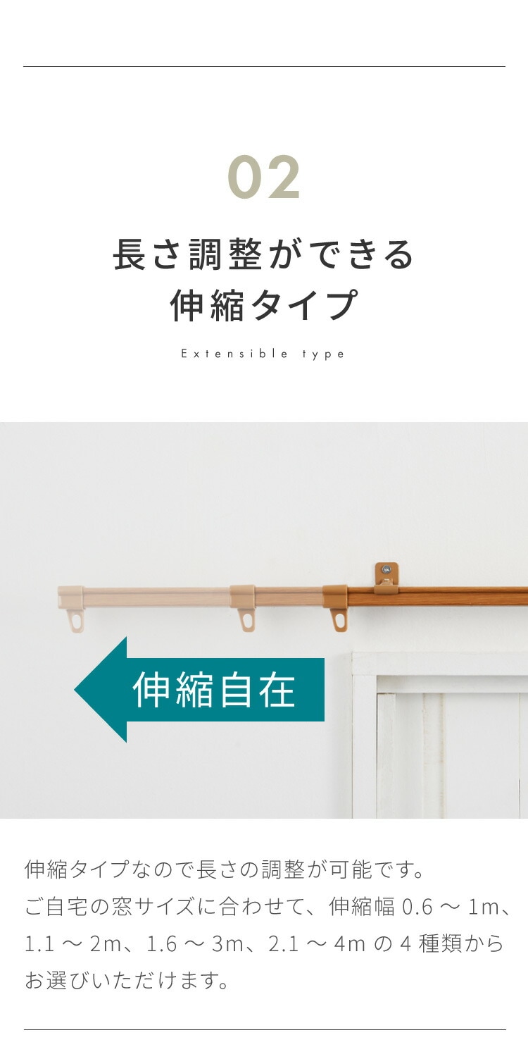 選べる4サイズ、選べる伸縮幅、0.6~1m、1.1~2m、1.6~3m、2.1~4m、賃貸、おしゃれ、北欧、レール、シンプル、かわいい、マンション、一軒家、新築、法人、ホテル、新生活、一人暮らし