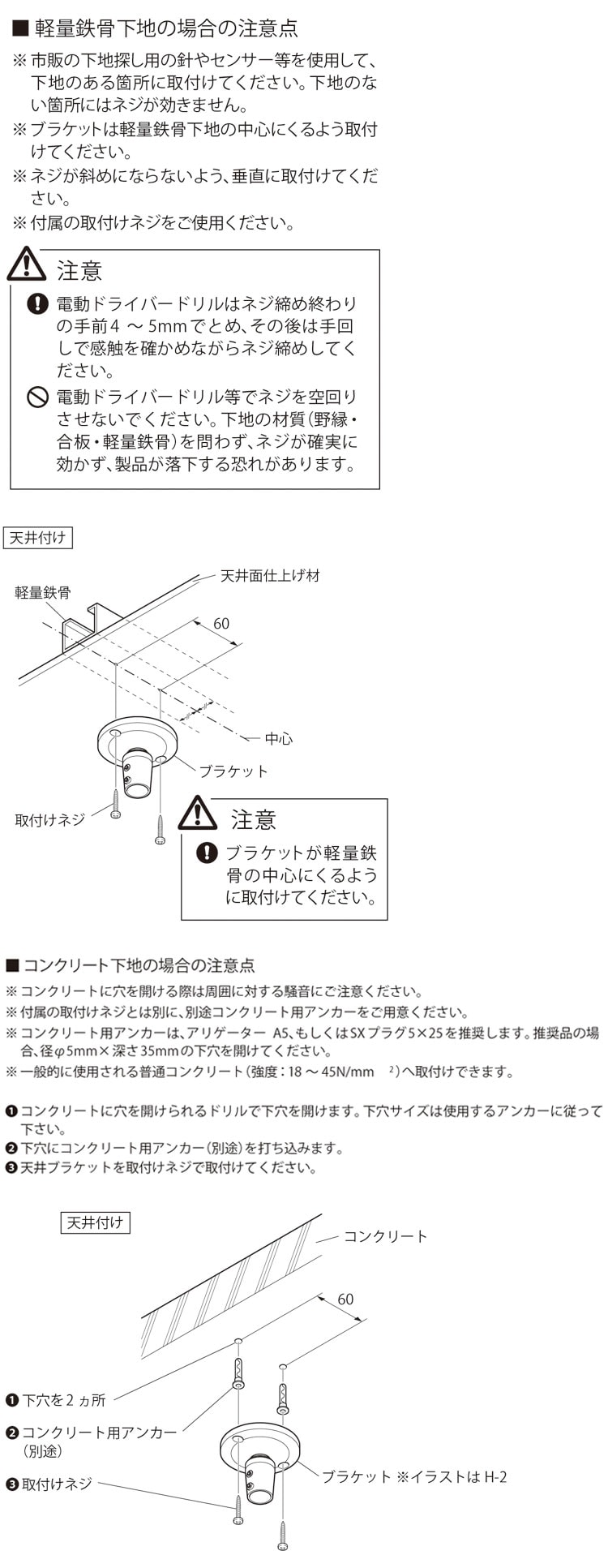 構造用合板(9mm以上)、角材(幅80mm以上、木部へのねじ込み深さ17mm以上)、野縁(木部:垂直方向、木部へのねじ込み深さ17mm以上)、コンクリート(コンクリート用アンカープラグ使用:別途)、野縁(木部:水平方向)、軽量鉄骨に取り付けが可能です。