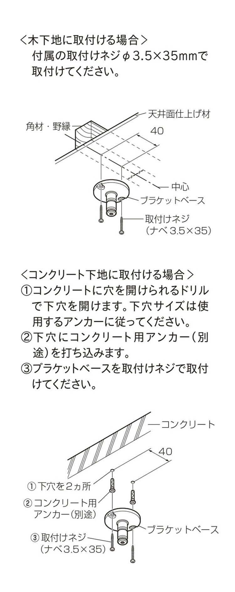※構造用合板(厚さ18mm未満)、野縁(木部:水平方向)、軽量鉄骨、石膏ボードのみなどには取付不可になります。