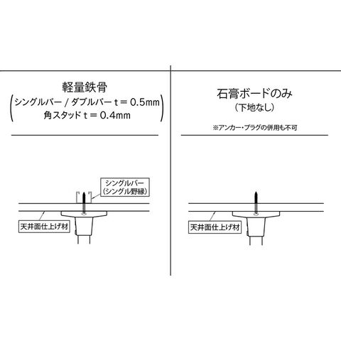構造用合板(厚さ12mm未満)、野縁(木部:水平方向)、軽量鉄骨、石膏ボードのみなどには取付不可になります。