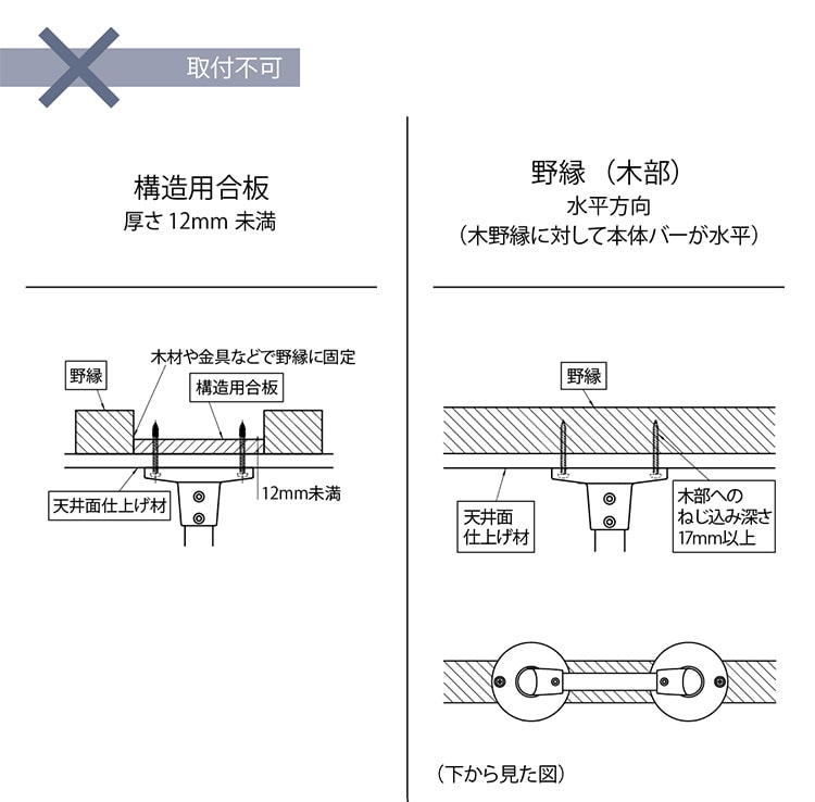 構造用合板(厚さ12mm未満)、野縁(木部:水平方向)、軽量鉄骨、石膏ボードのみなどには取付不可になります。
