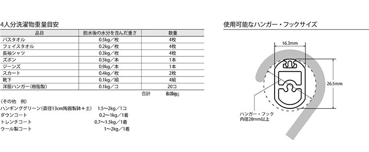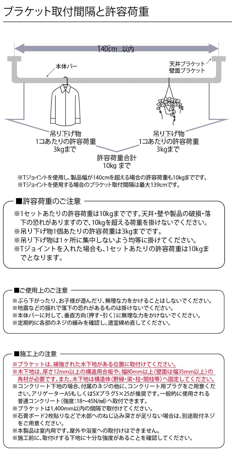 ・吊り下げ物1個あたりの許容加重:3kgまで