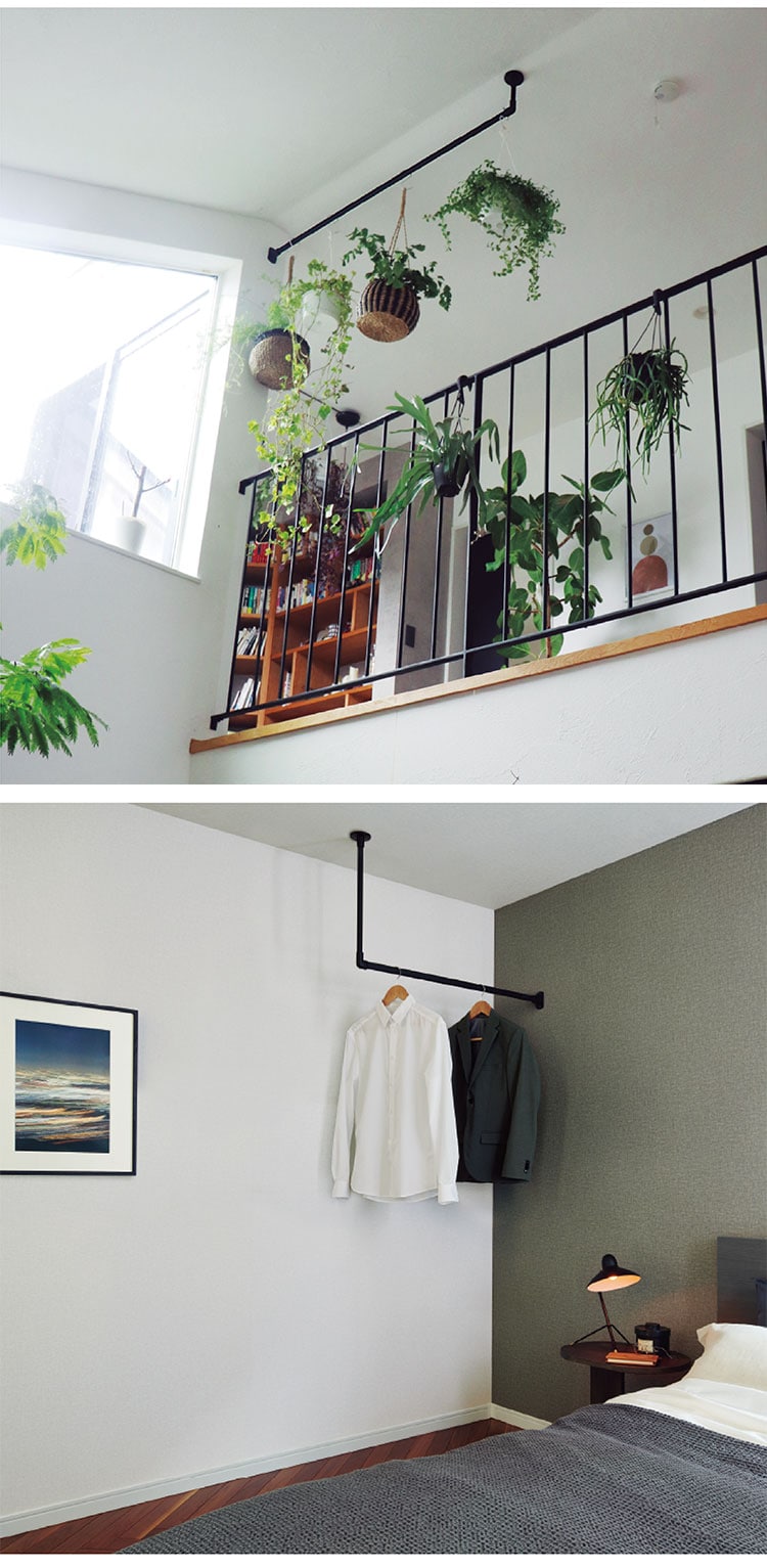 天井近くにハンギングバーを設置すれば、長さのあるグリーンやモビール、インテリア小物などをディスプレイすることができます。