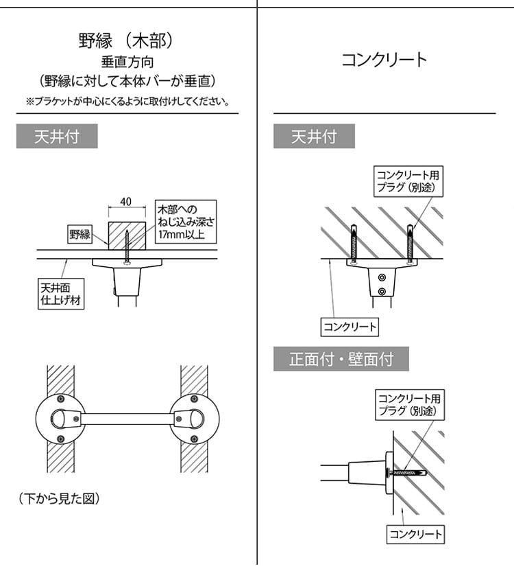 構造用合板(12mm以上)、角材(幅80mm以上(壁面の場合は35mm以上)※木部へのねじ込み深さ17mm以上、野縁(木部:垂直方向、木部へのねじ込み深さ17mm以上)、コンクリート(コンクリート用アンカープラグ使用:別途)に取り付けが可能です。