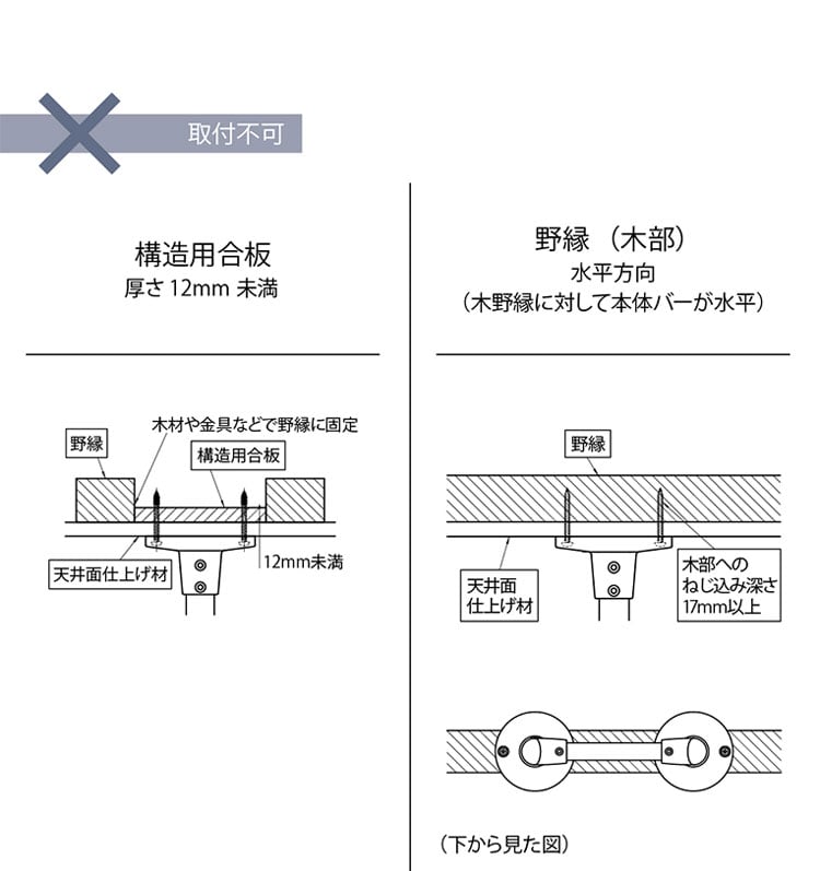 構造用合板(厚さ12mm未満)、野縁(木部:水平方向)、軽量鉄骨、石膏ボードのみなどには取付不可になります。
