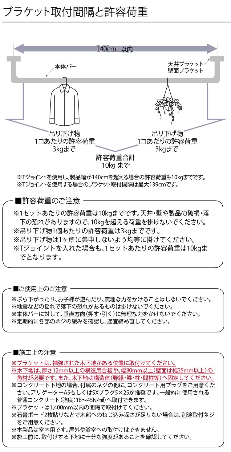 ・吊り下げ物1個あたりの許容加重:3kgまで