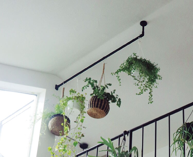 天井近くにハンギングバーを設置すれば、長さのあるグリーンやモビール、インテリア小物などをディスプレイすることができます。