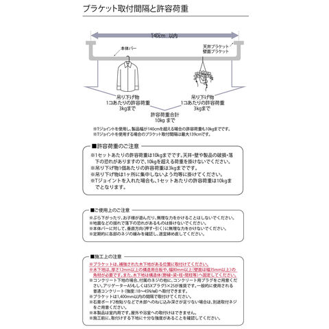 ・吊り下げ物1個あたりの許容加重:3kgまで