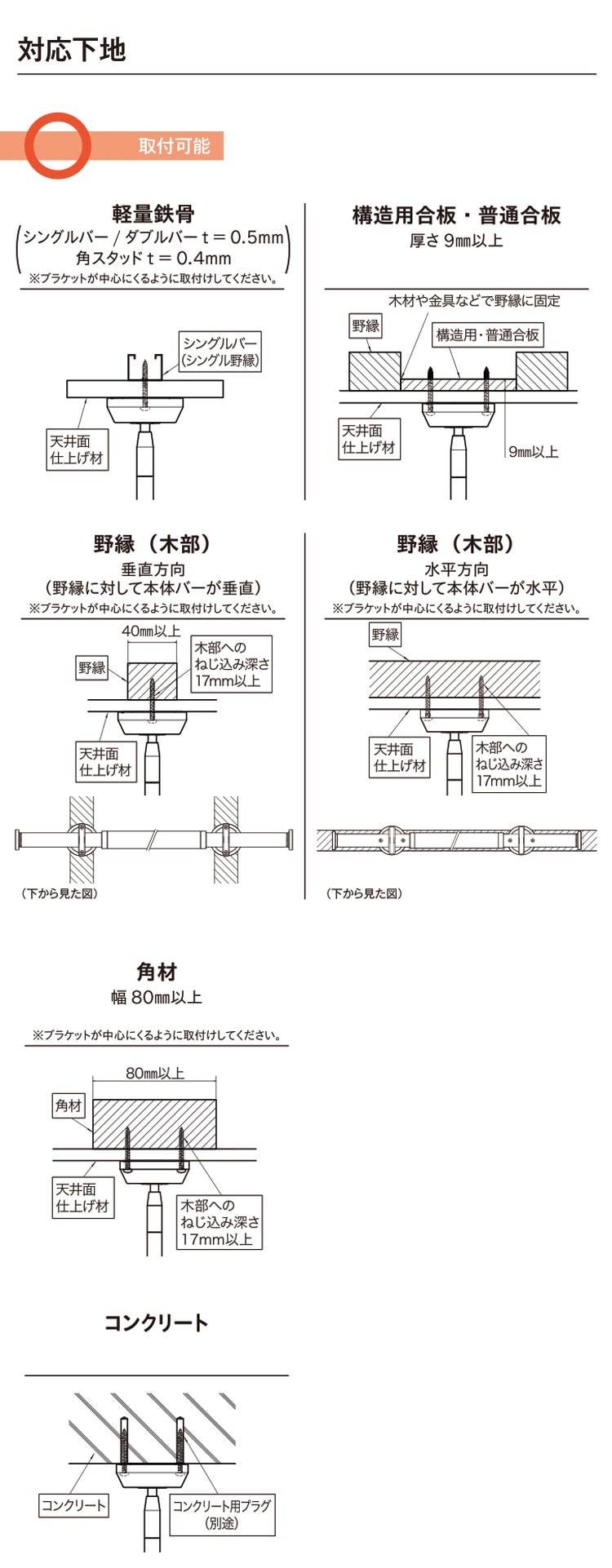 ブラケットは木下地、軽量鉄骨下地、コンクリート下地がある位置に取付けてください。