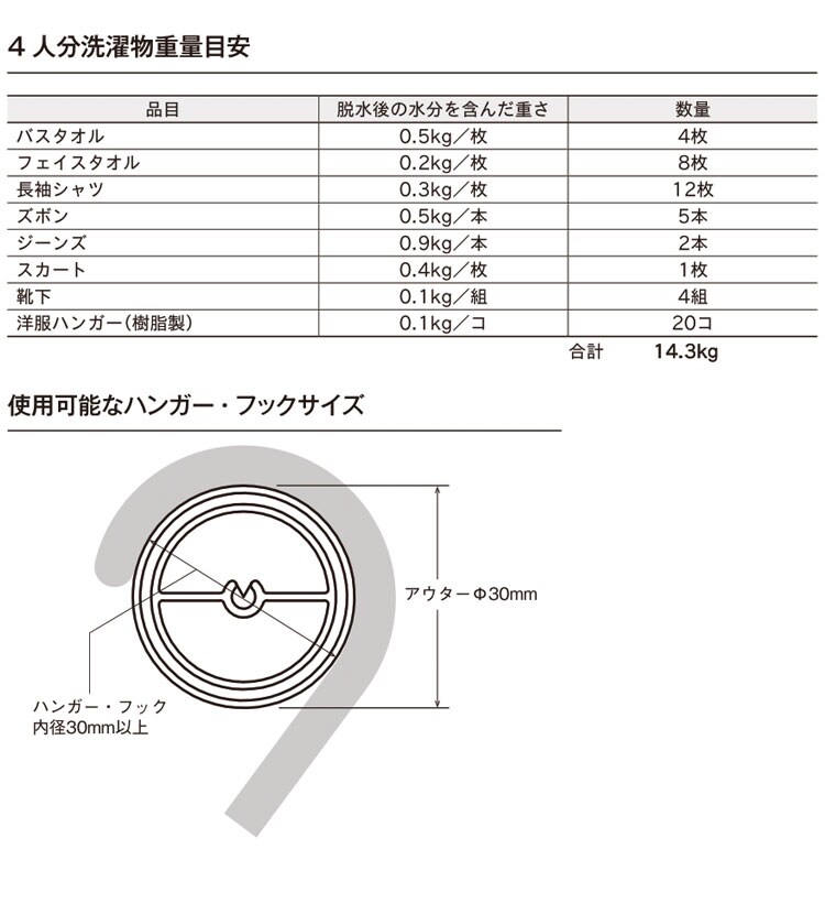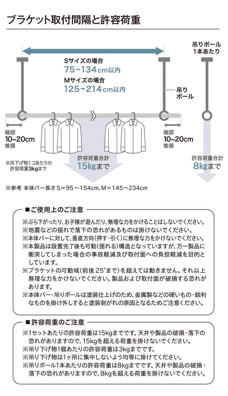・許容耐荷重:本体バー15kgまで、吊りポール1本あたり8kgまで