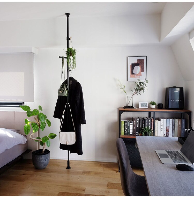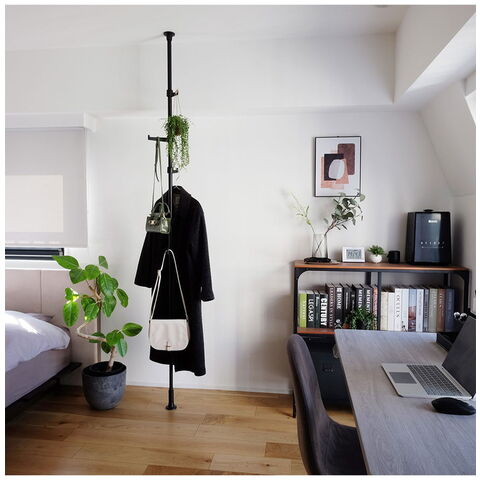 ・つっぱり棒を縦方向に使うハンガーラックです。高さが自由に調整できるため玄関やリビングのちょっとしたスペースを有効に活用いただけます。