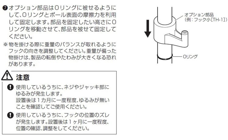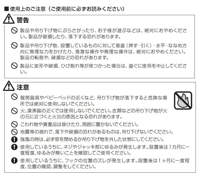 ・設置後は、安全にご使用いただくために、許容荷重以上のものを吊るさないようご注意ください。