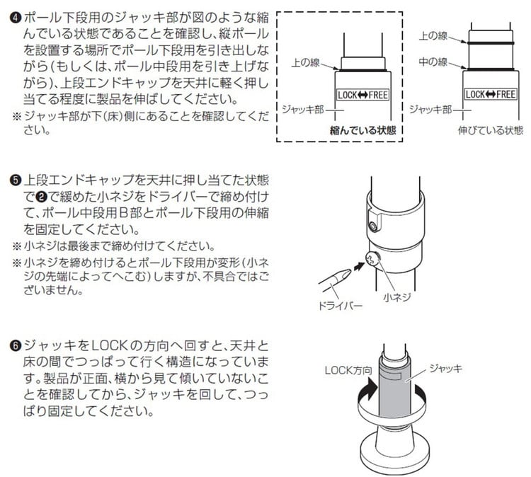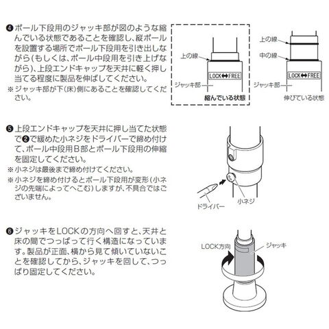 ・ジャッキ機構を採用したつっぱり棒なので簡単に確実に固定ができます。