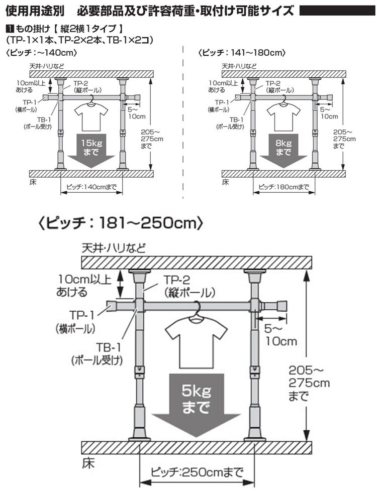 ・縦ポール間隔=250cm以内最大5kg