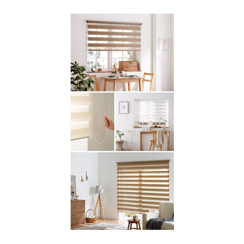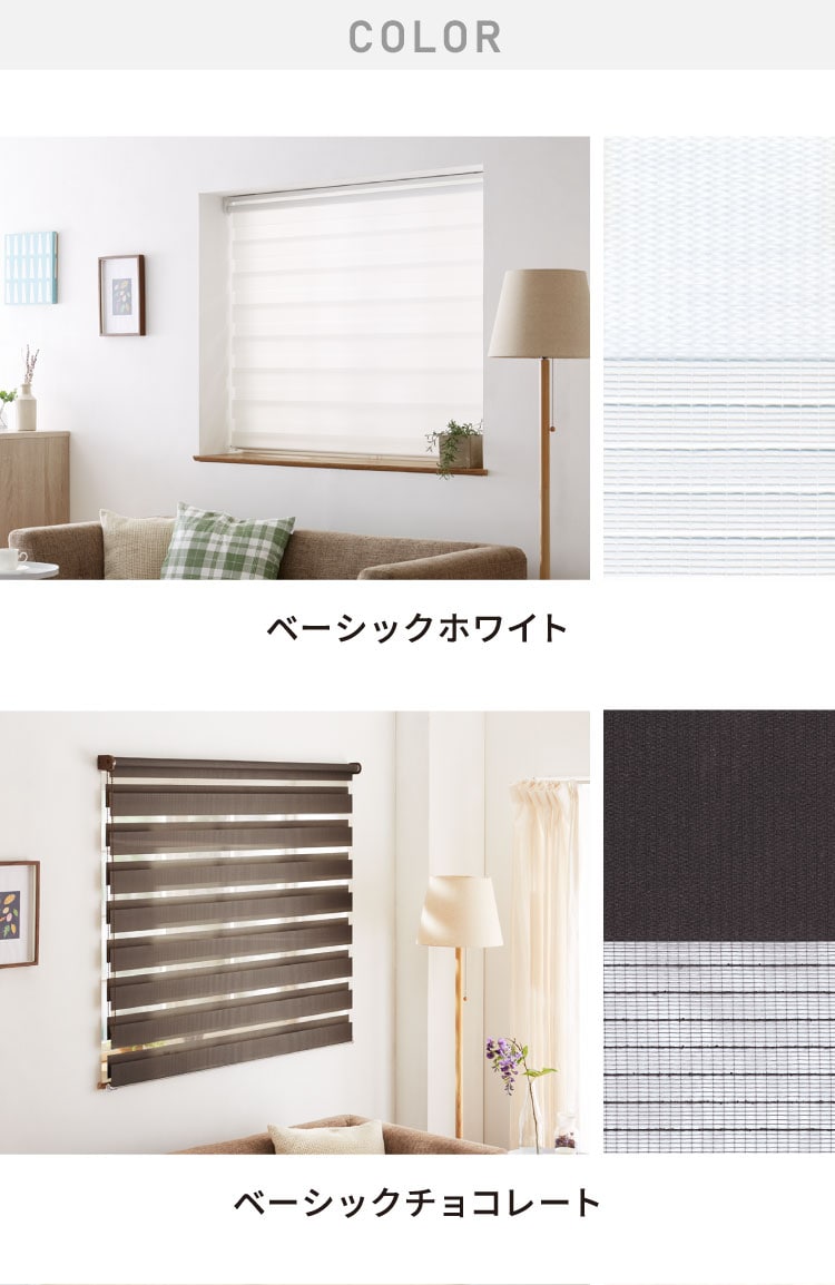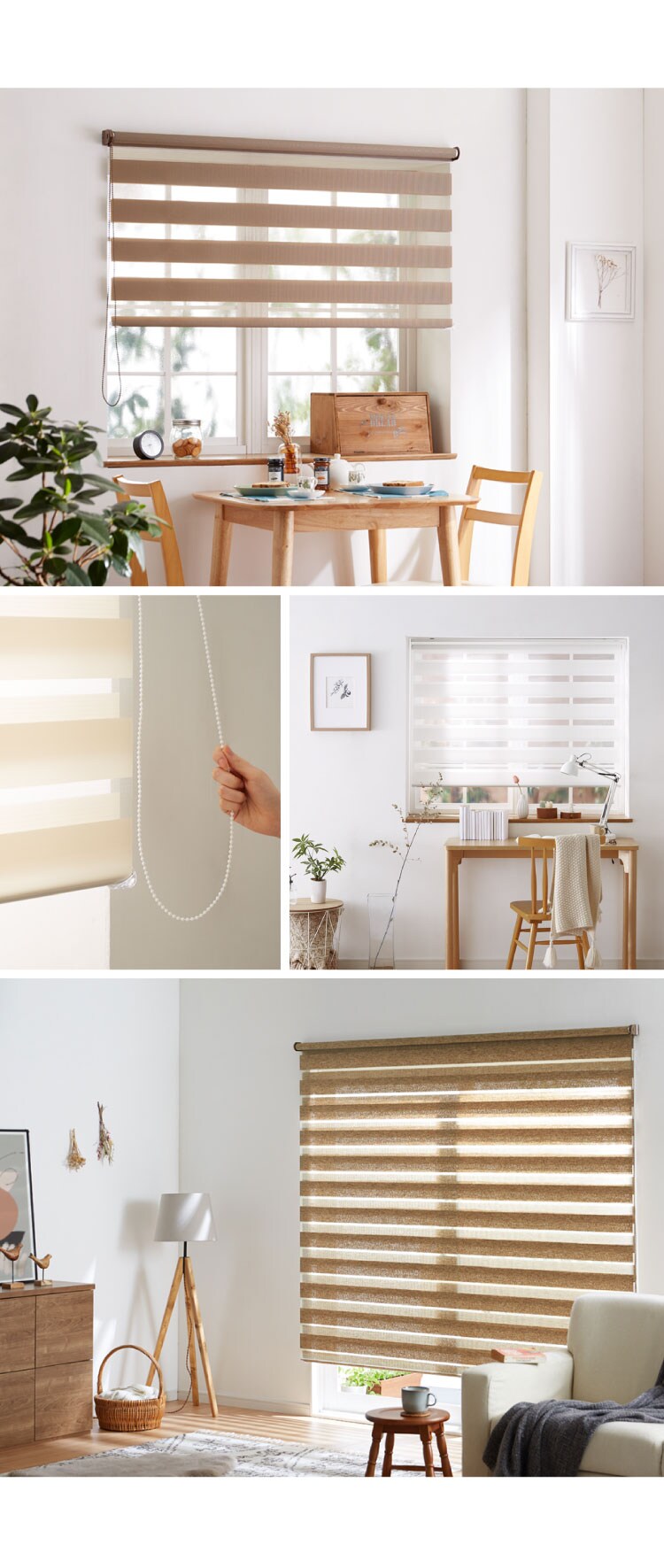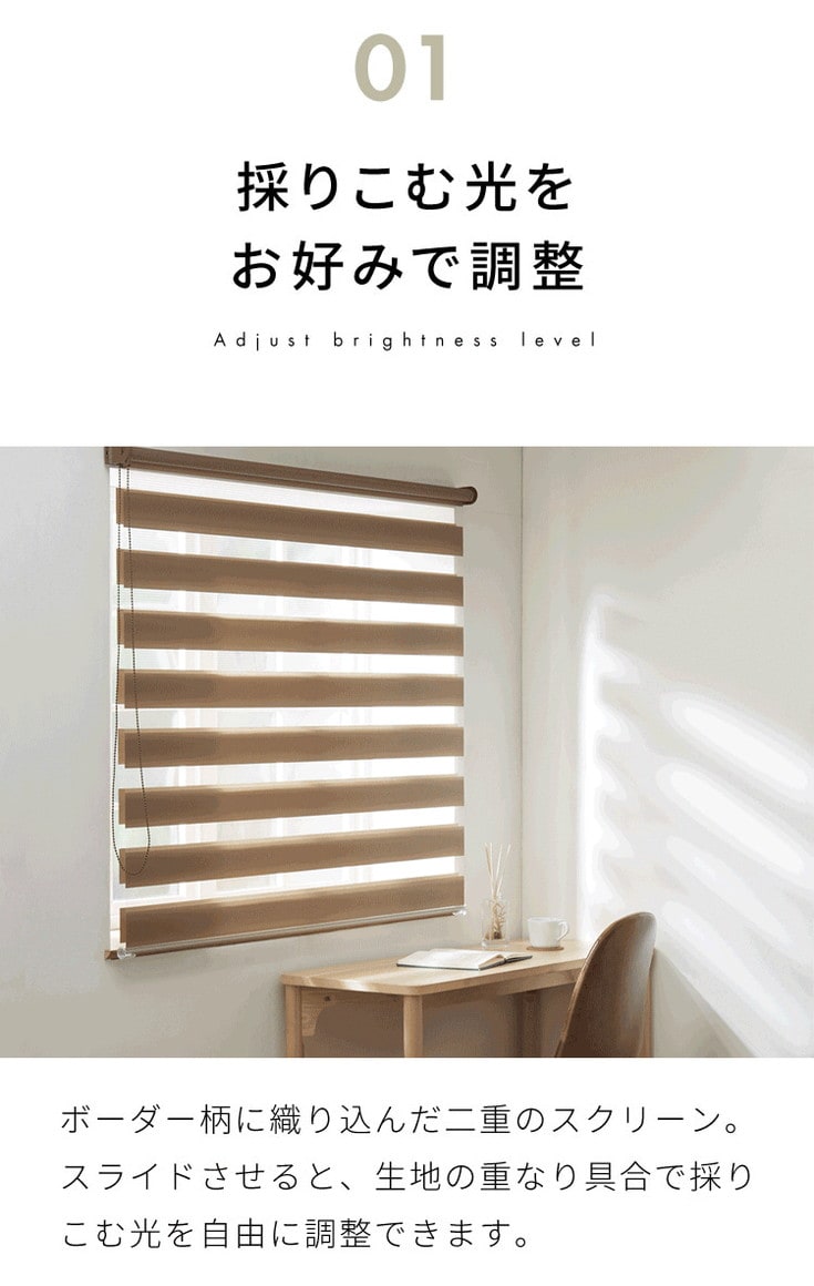 ・2種類の生地をボーダー柄に織り込んだスクリーンが上下に交差することにより、光の量をコントロールできる新しいタイプのロールスクリーンです。