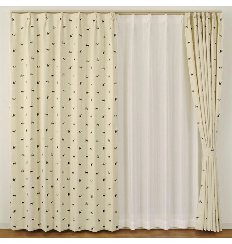 シルエットの黒ねこがプリントされたドレープカーテン。太陽光を取り入れる非遮光タイプで軽い風合いです。