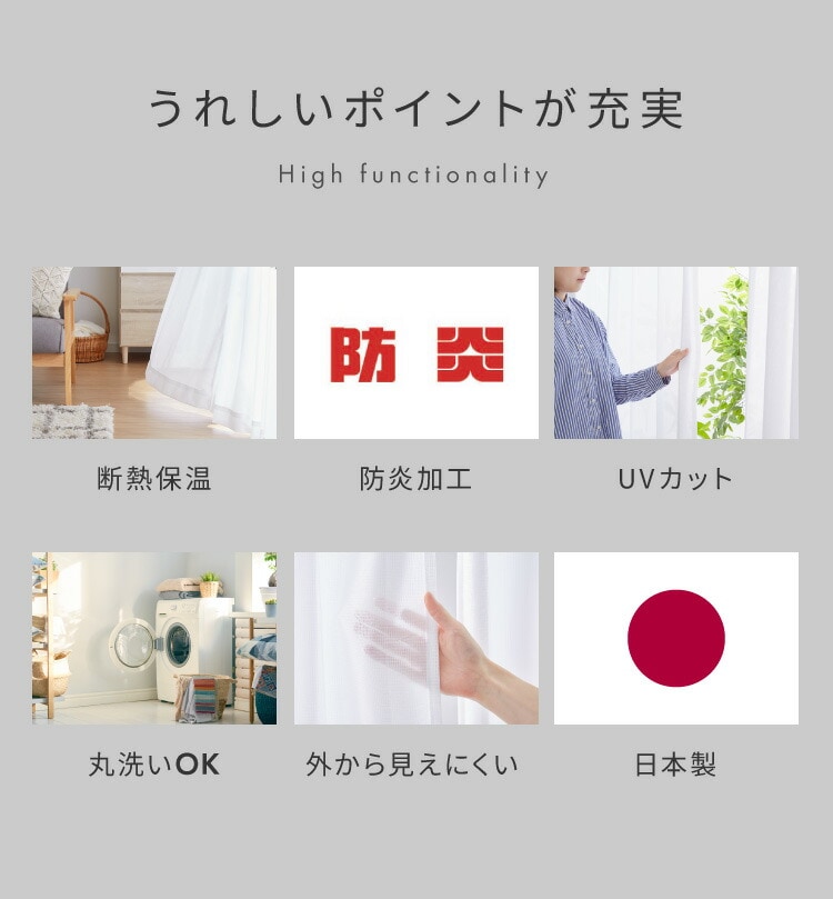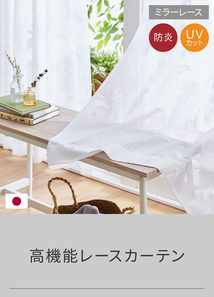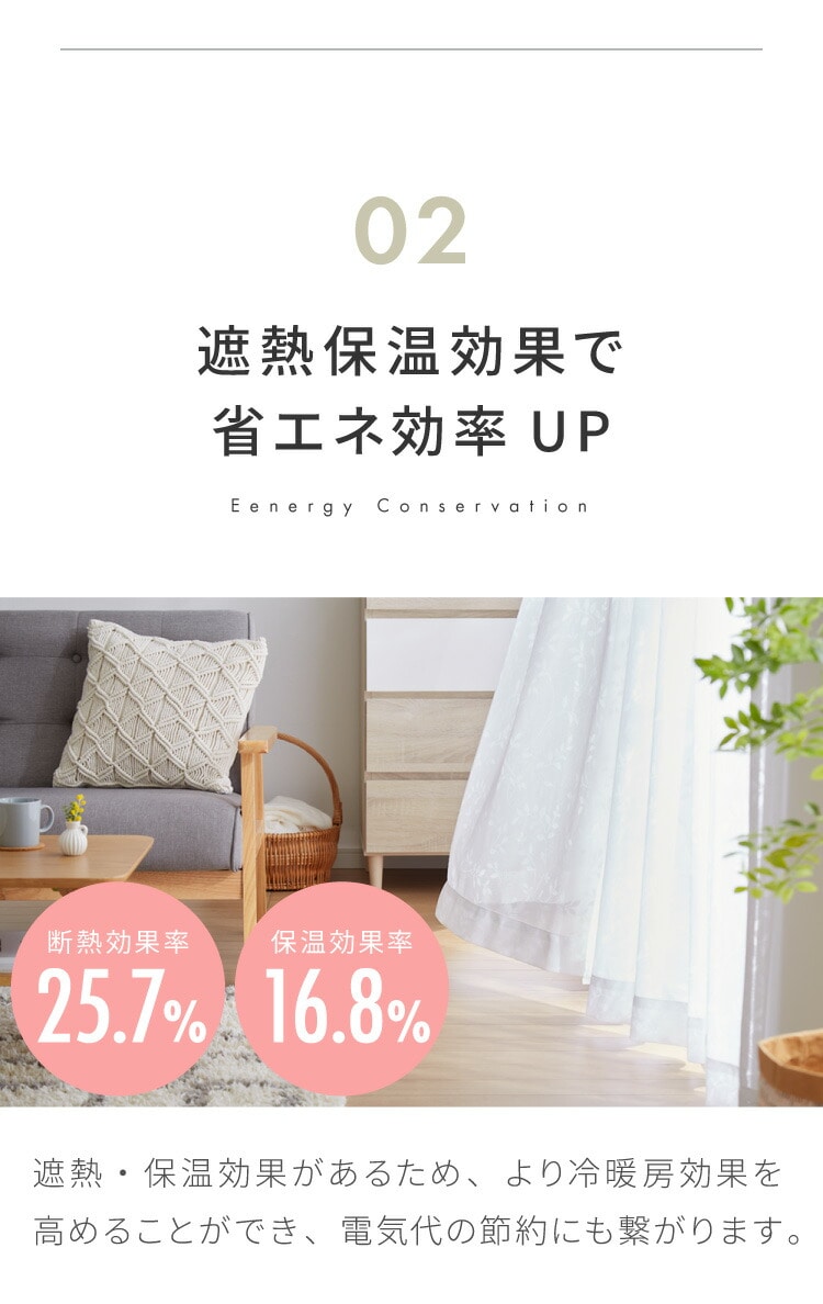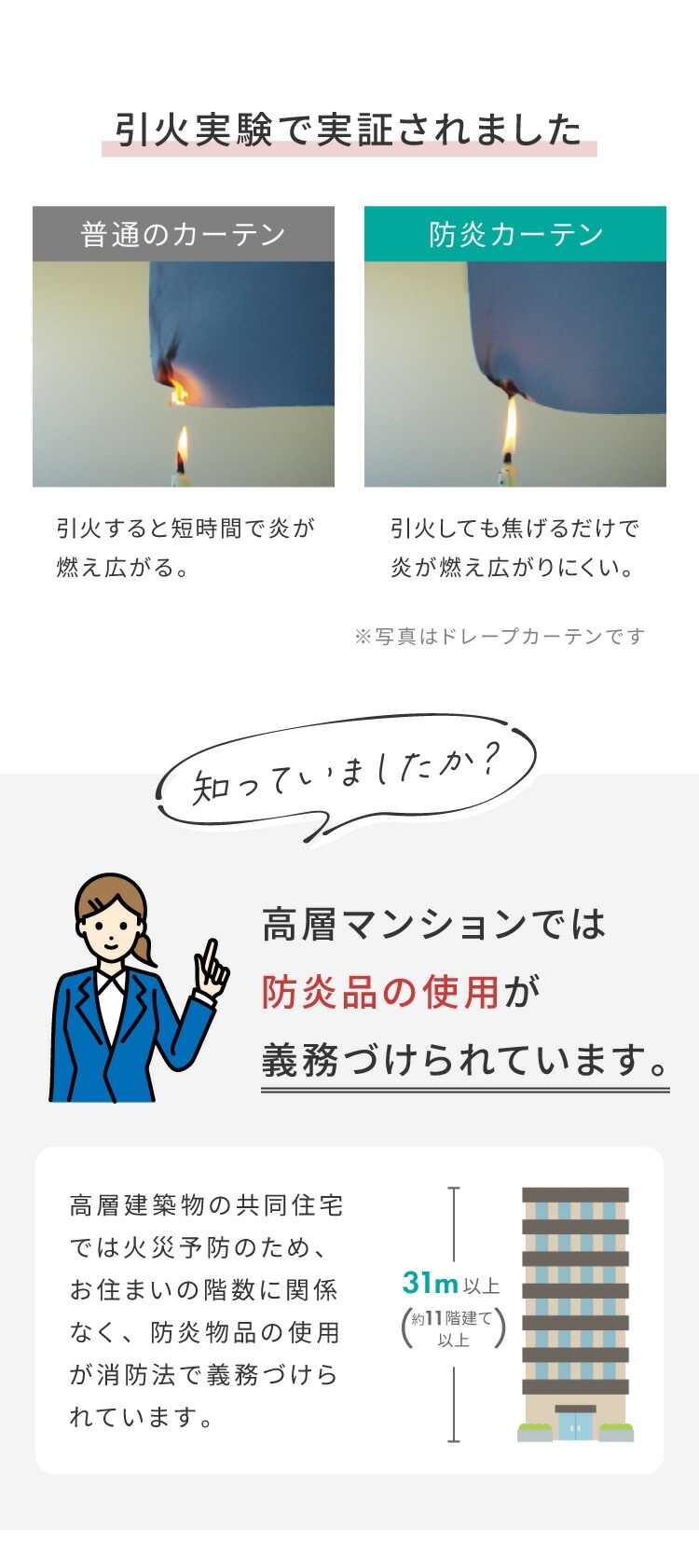 シンプルな花柄が可愛らしい印象を与えます。安全を考えた“防炎加工”付き。通常のカーテンに比べて燃え広がりにくい性質!火災の延焼を抑える働きがあります。
