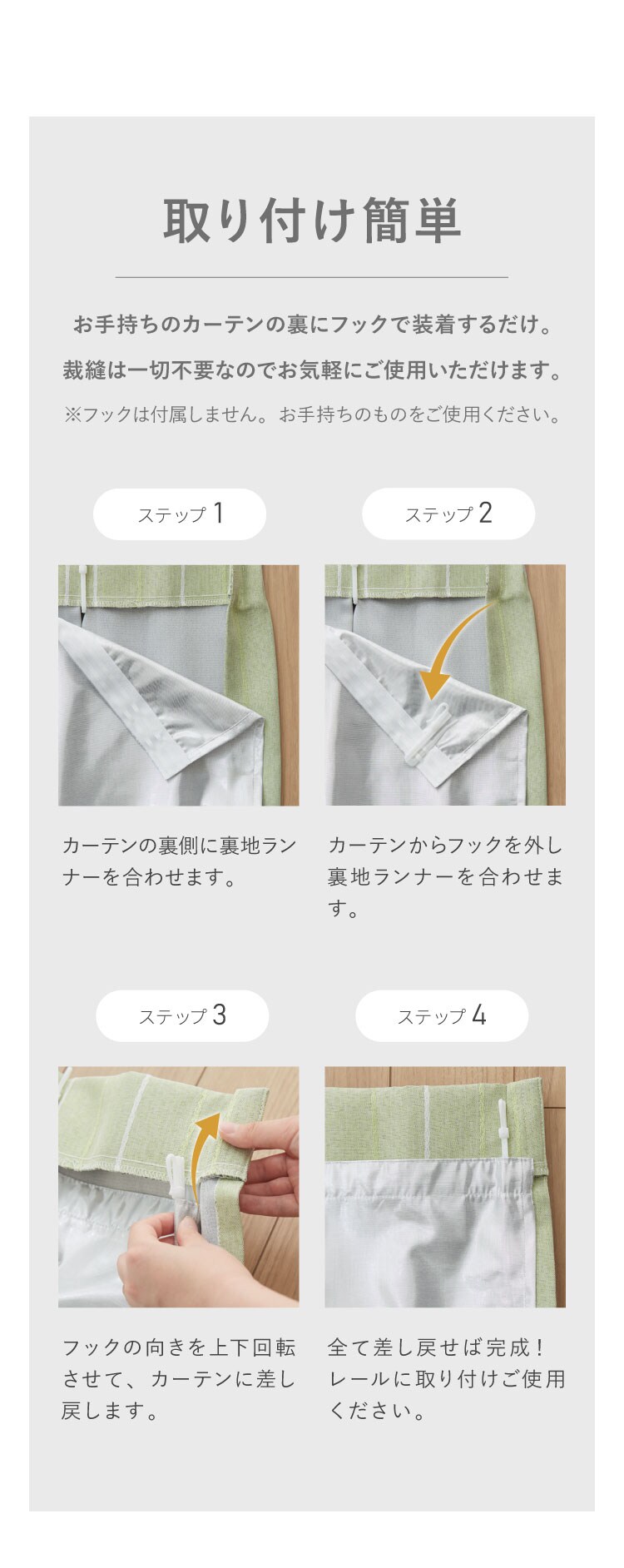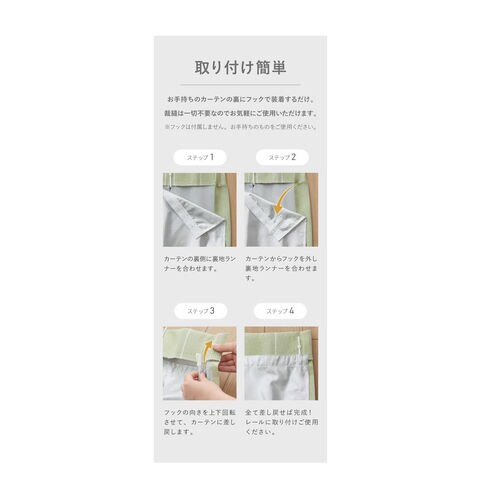 お手持ちのレースカーテンにかんたん取付!厚地カーテンにも取付できます。