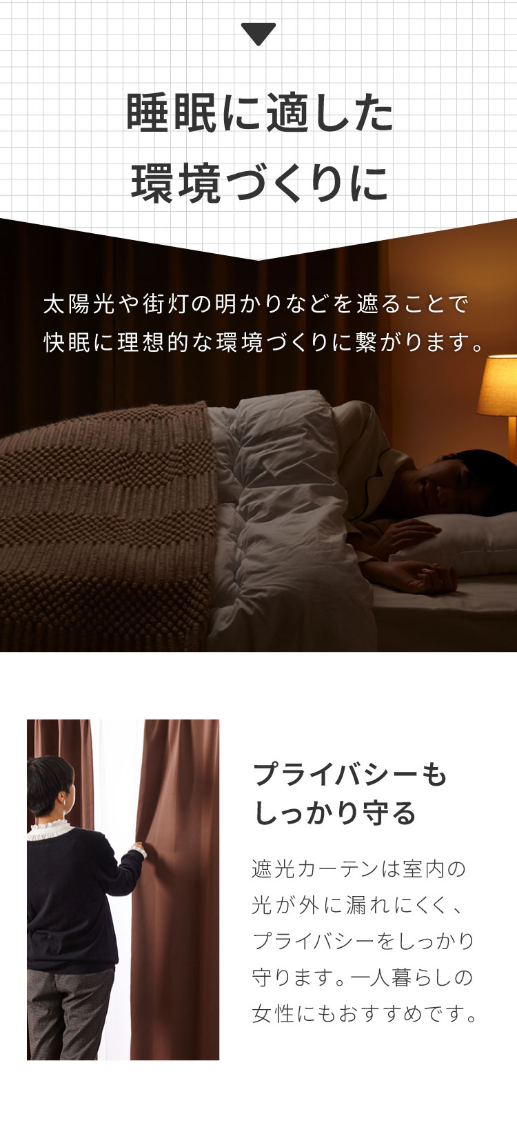 日差しや紫外線を防ぐ1級遮光のカーテンは、睡眠に適した環境をサポートします。