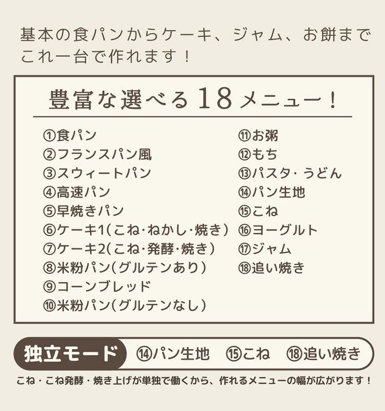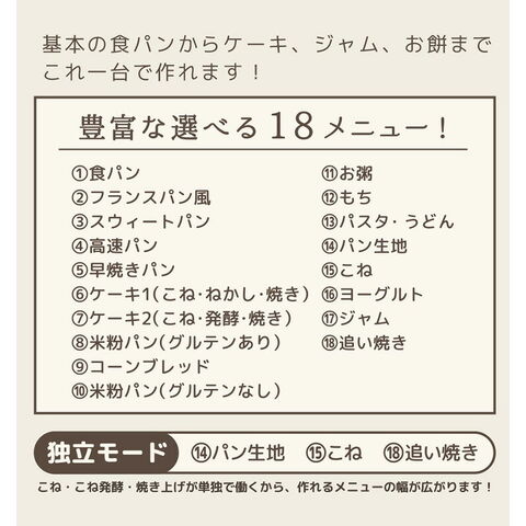 ●食パン、フランスパン風、スウィートパン、高速パン、早焼きパン、ケーキ1(こね・ねかし・焼き)、ケーキ2(こね・発酵・焼き)、米粉パン(グルテンあり)、コーンブレッド、米粉パン(グルテンなし)、お粥、もち、パスタ・うどん、パン生地、こね、ヨーグルト、ジャム、追い焼き。