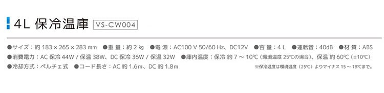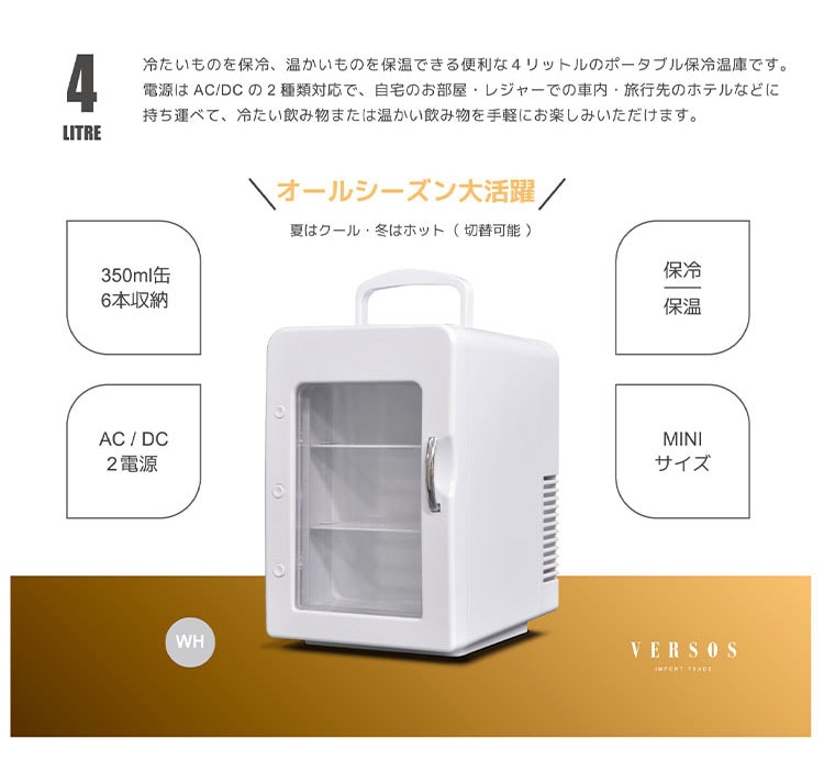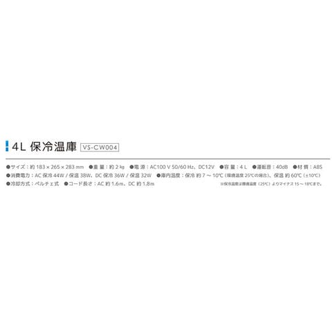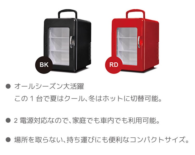 ●『保冷』と『保温』の2つの機能を搭載した冷温庫。夏は『保冷』、冬は『保温』と使い分けることができます。スタイリッシュなデザインながら4リットルサイズです。DC12V対応なのでご家庭だけでなく車載用としてもご利用いただけます。アウトドアや行楽でも大活躍。