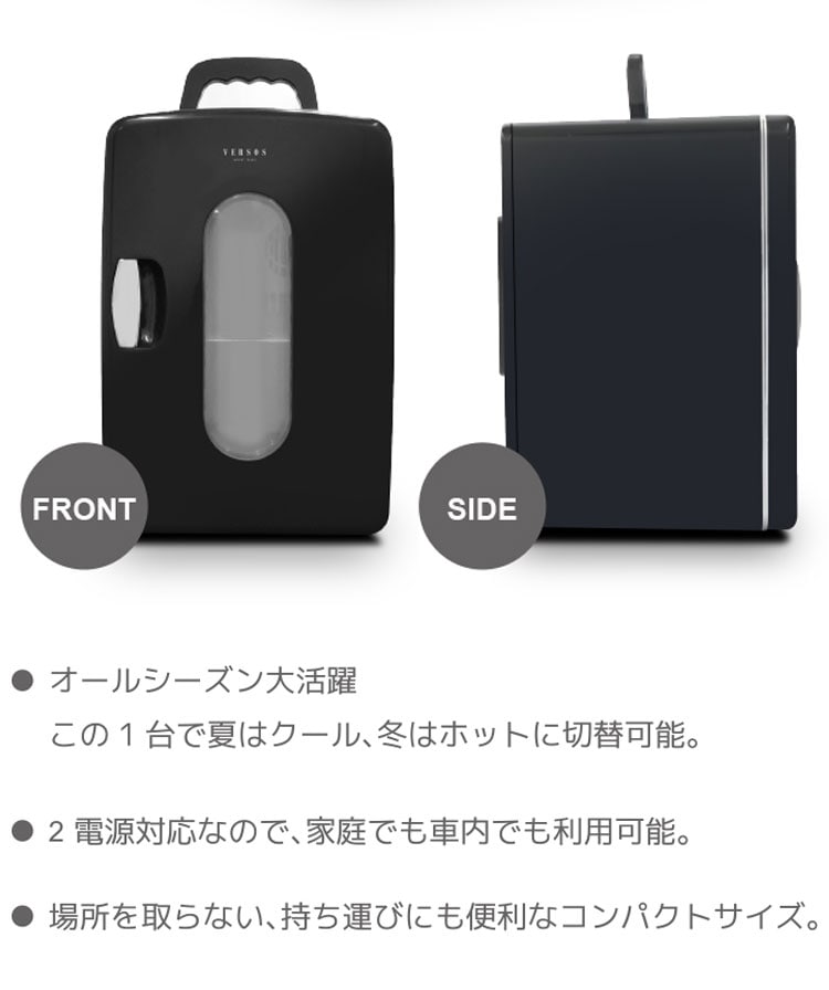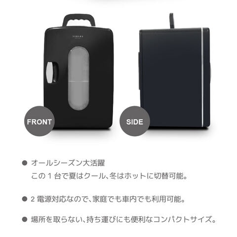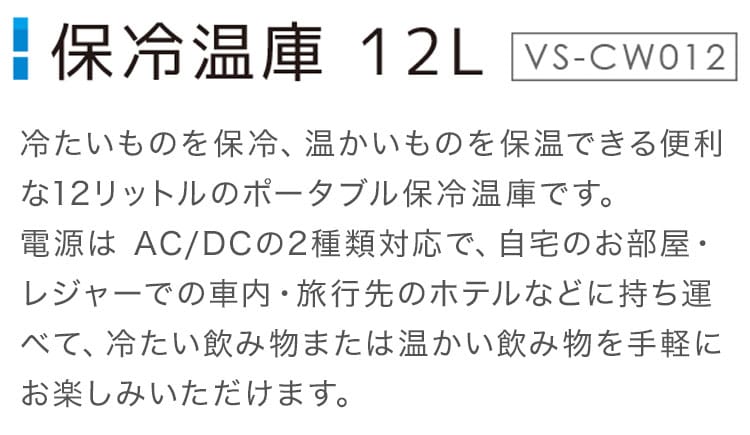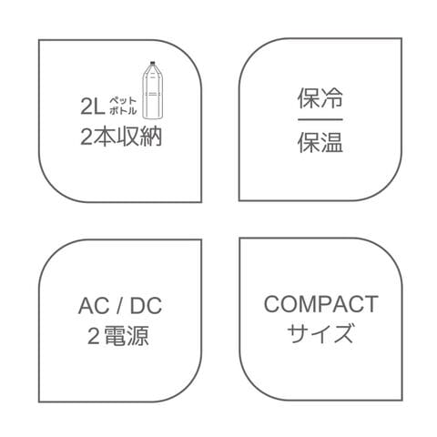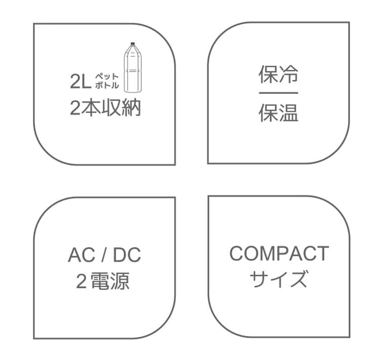 電源はAC/DCの2種類対応で自宅のお部屋・レジャーでの車内・旅行先のホテルなどに持ち運べて、冷たい飲み物また暖かい飲み物を手軽にお楽しみいただけます。