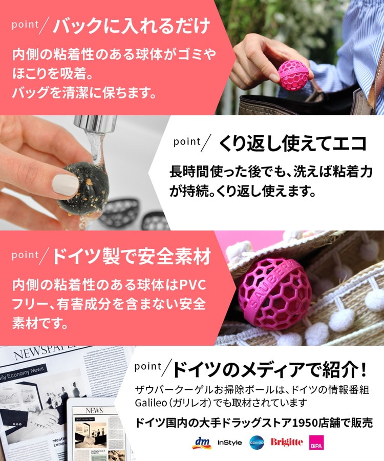 point1.バッグに入れるだけ【使い方カンタン】内側の粘着性のある球体がゴミやほこりを吸着。バッグを清潔に保ちます