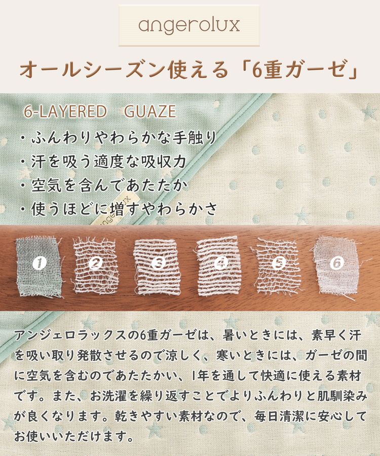 暑いときには、素早く汗を吸い取り発散させるので涼しく、寒いときには、ガーゼの間に空気を含むのであたたかい、1年を通して快適に使える素材です。乾きやすい素材なので、毎日清潔に安心してお使いいただけます。