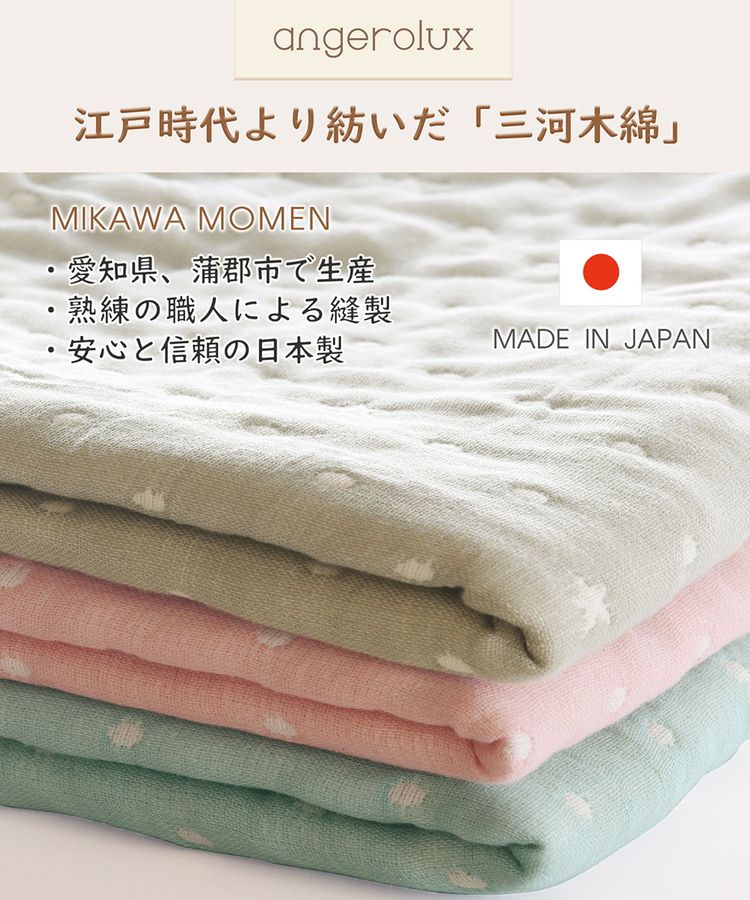 ●暑いときには、素早く汗を吸い取り発散させるので涼しく、寒いときには、ガーゼの間に空気を含むのであたたかい、1年を通して快適に使える素材です。乾きやすい素材なので、毎日清潔に安心してお使いいただけます。