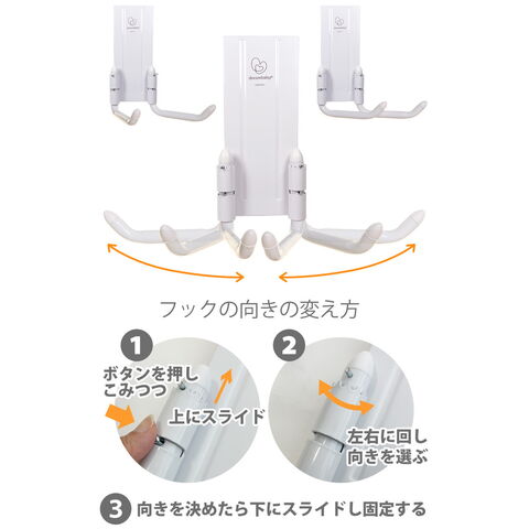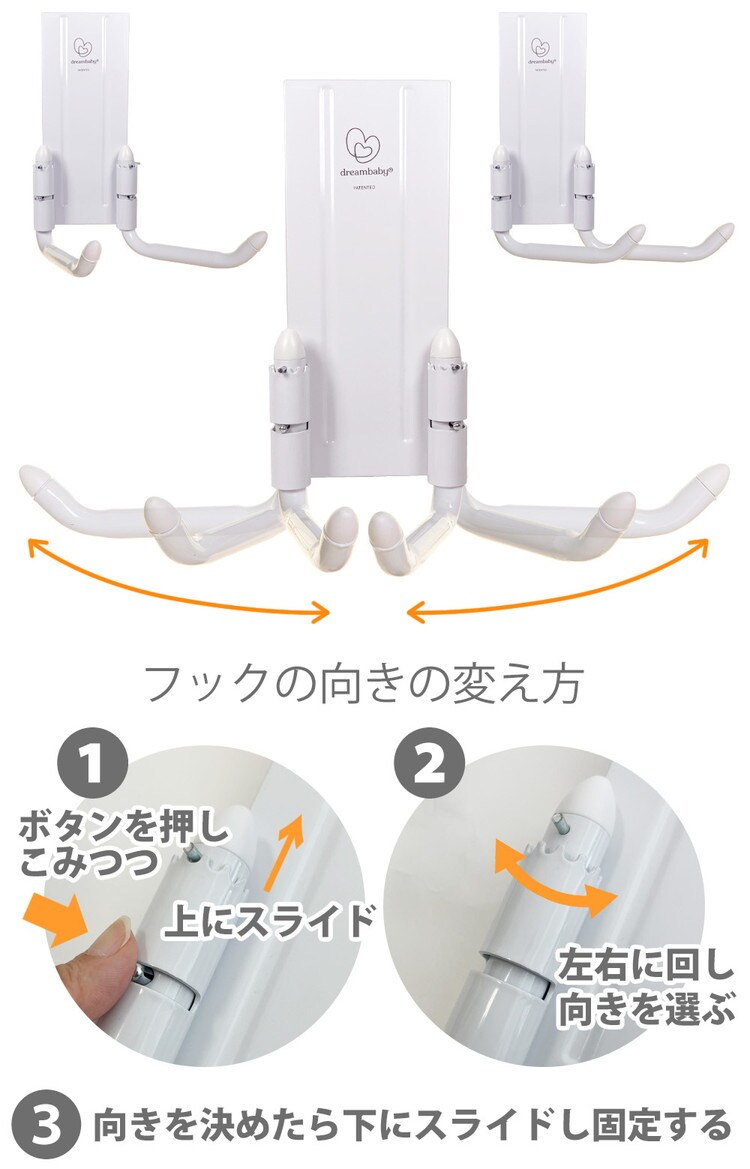 ベビーカーのハンドルを引っ掛けるための2本のフックは、左右に向きを自由に動かせます。ベビーカーのハンドルやタイプによって引っ掛ける位置や向きを簡単に調整できます。