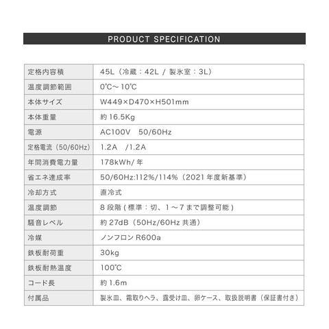 容積:冷蔵:42L / 製氷室:3L