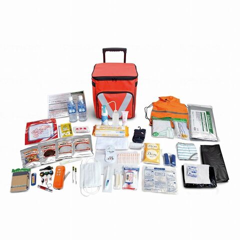 ○セット内容:手鏡付き裁縫セット、生理ナプキン、洗浄ビデ、ドライシャンプー、体拭きシート、除菌ティッシュ、笛付LEDライト、FMラジオ付多機能自家発電ライト、一体型フード付きナップザック、オールインワンクリーム、ヘアブラシ、使い捨て下着×2、生理用下着、簡易トイレセット(3枚)×1、CRRマウスピース、アルミシート、ボールペン付メモ帳、シート体温計(2枚)、包帯、雨衣(レインコートまたはポンチョ)、軍手・笛・ロープセット、ガーゼ付救急絆創膏×6、靴下、収納ポーチ、タオル、マスク×2、歯ブラシセット、ゴミ袋