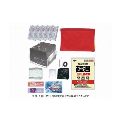 ○セット内容:清浄綿×6、ポーチ×1、ナプキン(6個入)×1、パンティーライナー×2、ディスポショーツ×1、ポリ袋×3、美容液×1、化粧水×1、クレンジングシート(2枚入)×1、毛抜きピンセット×1、ヘアピン×2、ヘアゴム×1、カイロ×1