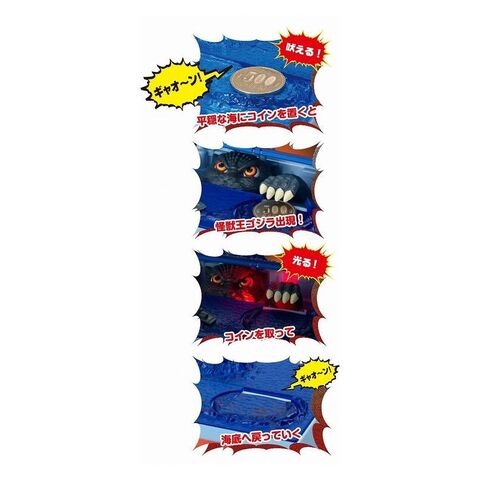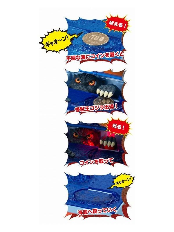 ・コインを海面に置くと、ゴジラが咆哮!光とともに海面を割って登場し、コインを取って海底へ戻っていきます。・音声パターンは全8種。劇中のBGMも収録。・ステッカーは西川伸司氏の書下ろしイラスト!