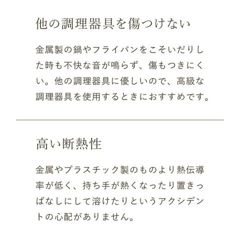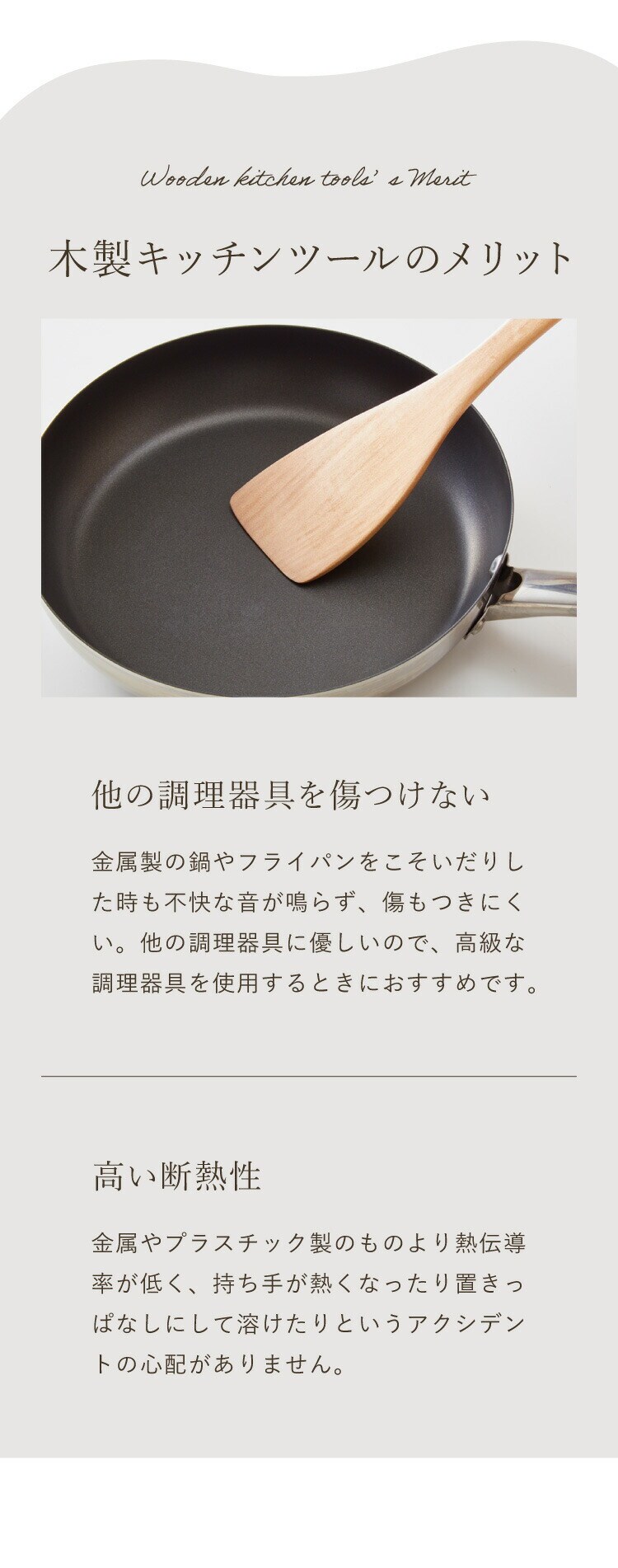 木製のキッチンツールは鍋・フライパンを傷つけにくく、フッ素やコーティングが長持ちします。