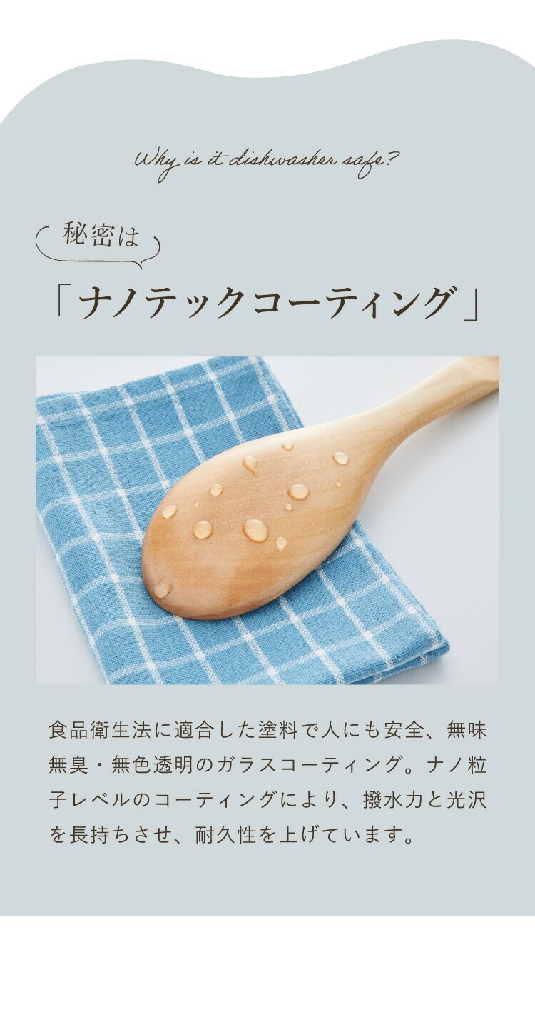 従来の木製製品は食洗機の使用はできませんでしたが、「ナノテックコーティング」という特殊加工を施すことで食洗機対応となっています。