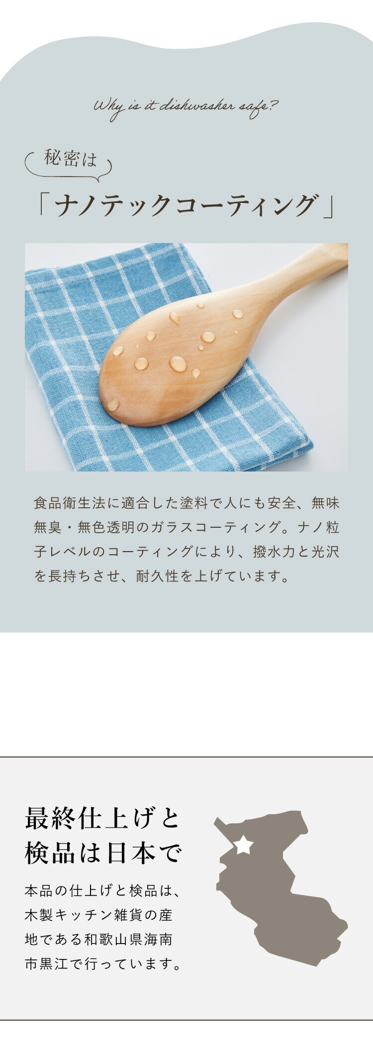 従来の木製製品は食洗機の使用はできませんでしたが、「ナノテックコーティング」という特殊加工を施すことで食洗機対応となっています。