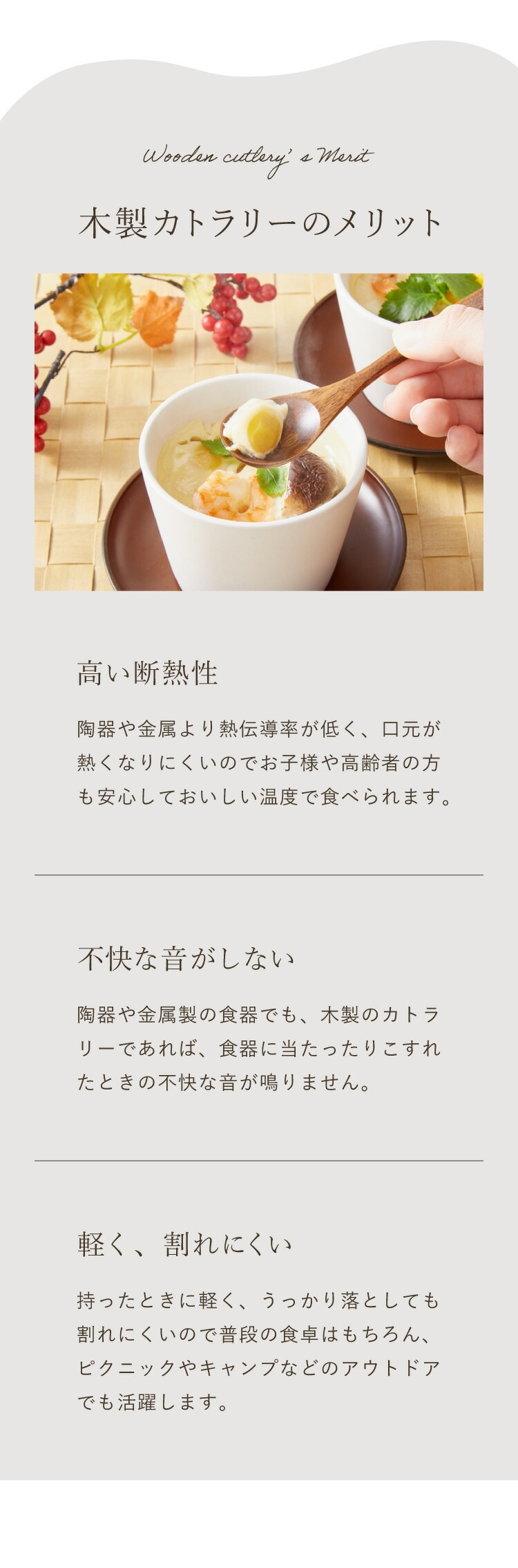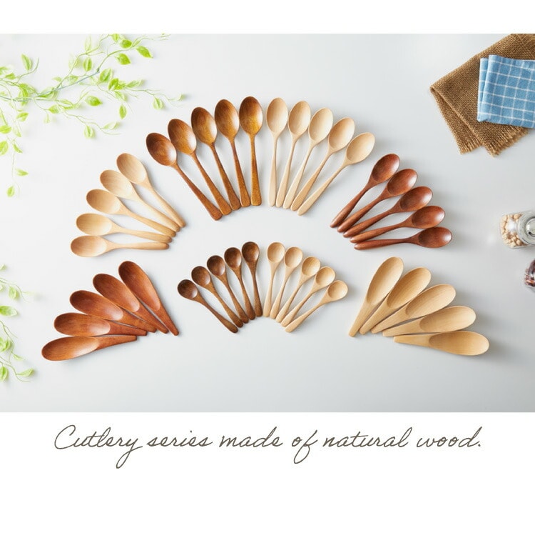 木製のナチュラルな質感・さわり心地をはそのままに、利便性を高めたカトラリーです。