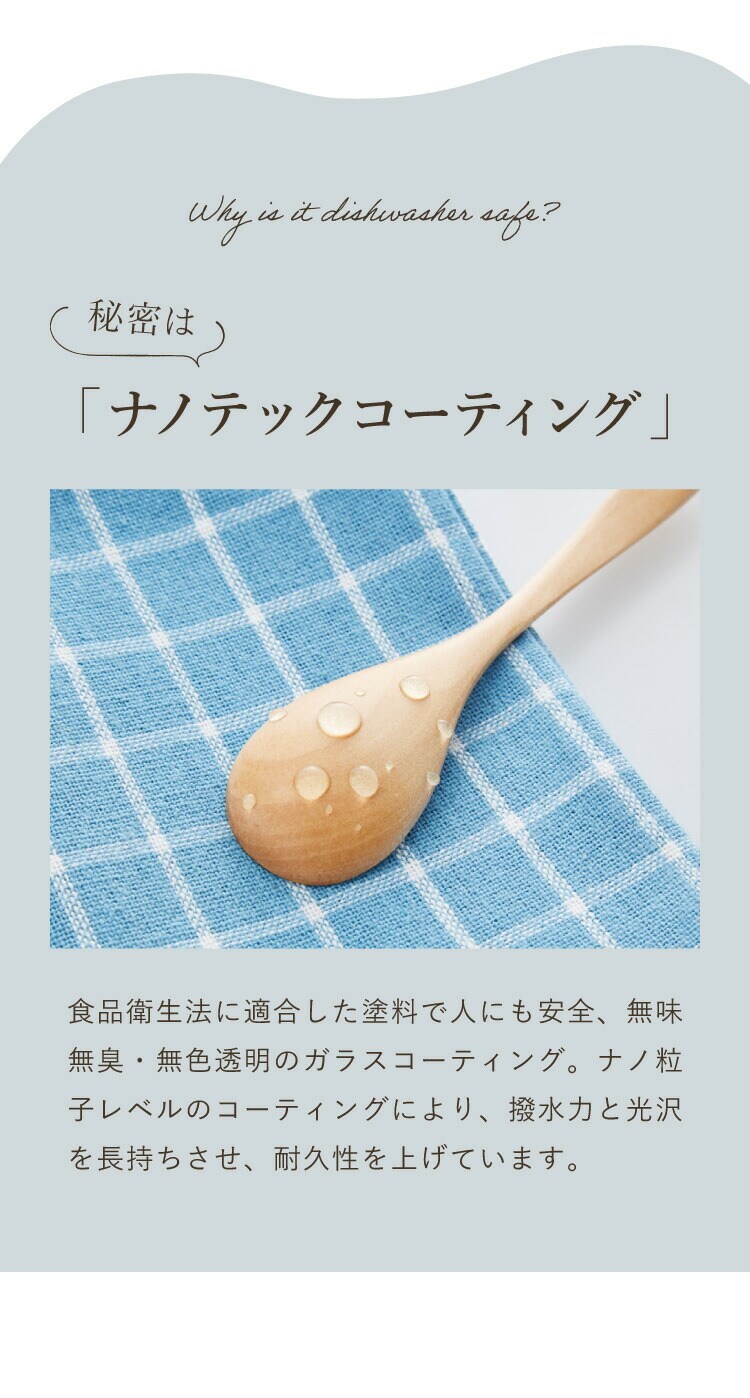 従来の木製製品は食洗機の使用はできませんでしたが、「ナノテックコーティング」という特殊加工を施すことで食洗機対応となっています。