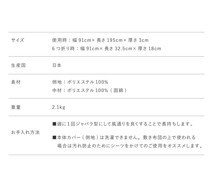 中材も安心の日本製の固綿素材を使用。六つ折りタイプのマットレスなので、車中泊やキャンプでもご使用いただけます。