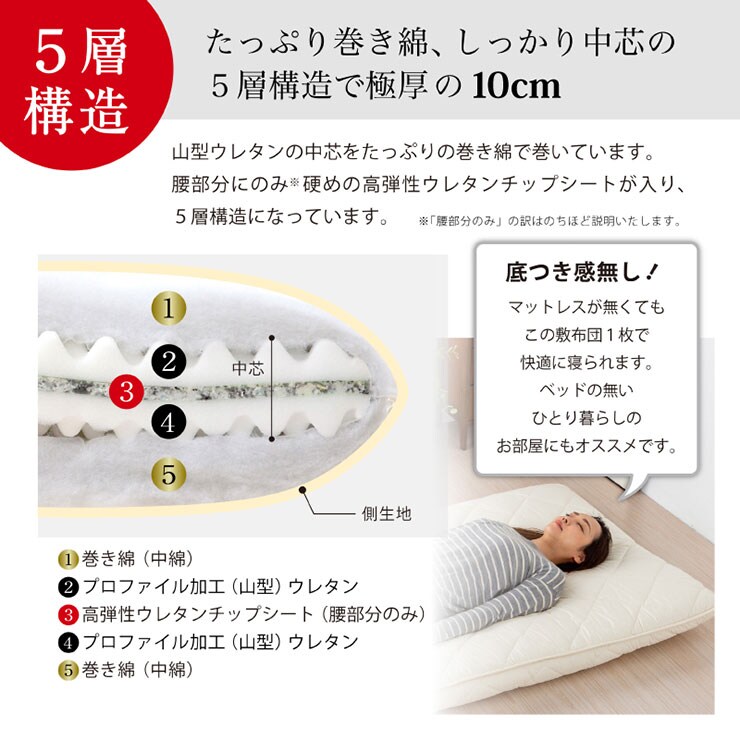 極厚10cmの国産敷布団。ウレタンと綿の5層構造でふわふわな寝心地を実現します。