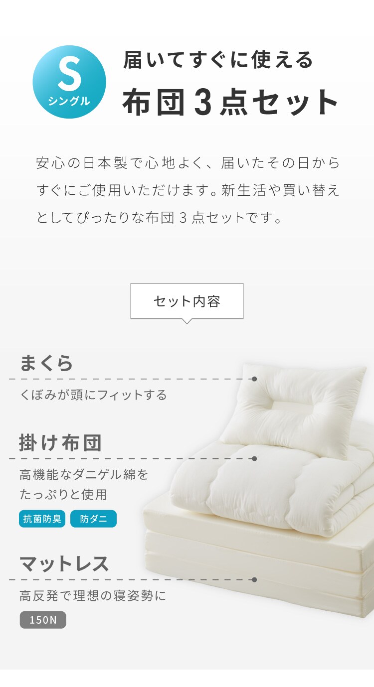 布団3点セット 日本製 マットレスタイプ 掛け布団 枕 マットレス シングル 圧縮梱包 東レ TORAY ダニゲル 抗菌 防臭 防ダニ 機能性綿 ウレタン 掛布団 敷布団 まくら シンプル おしゃれ インテリア【送料無料】