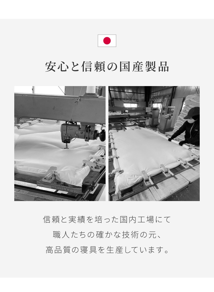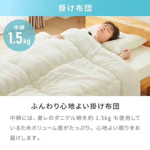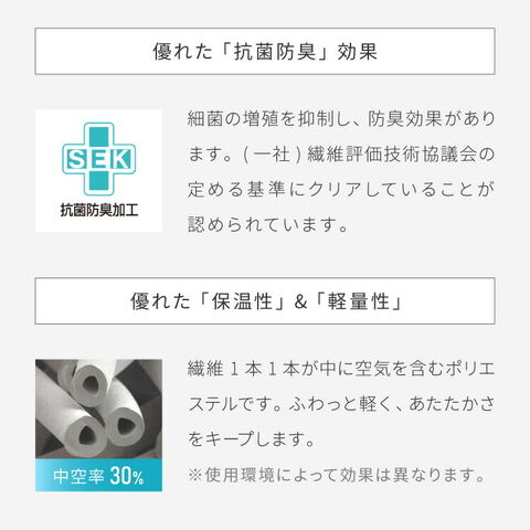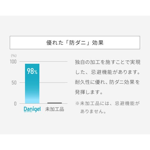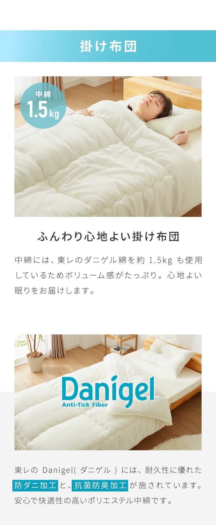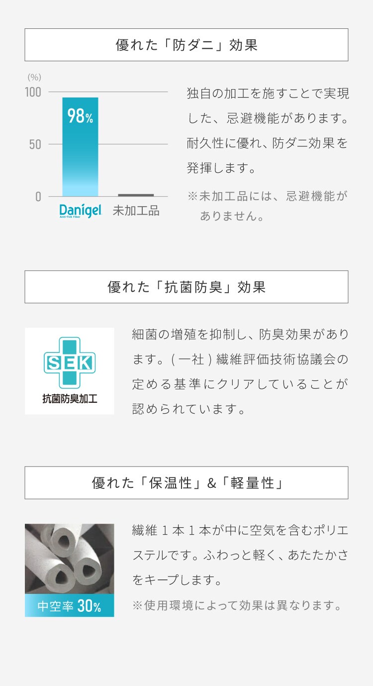 掛ふとんについては抗菌・防臭・防ダニ機能付きのTORAY(ダニゲル)綿を使用。