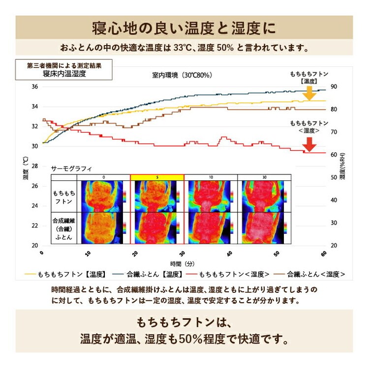 睡眠に最適とされる「温度33度・湿度50%」をキープしやすい素材だから、
