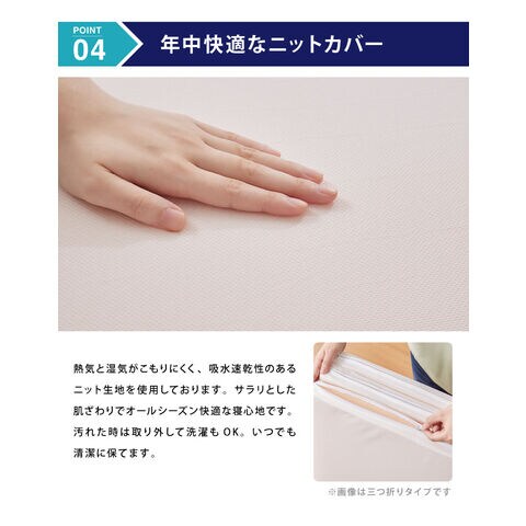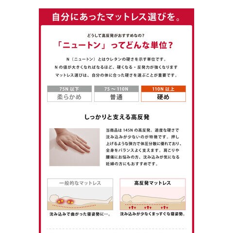 高密度で高反発のウレタンで寝心地アップ。適度な硬さで体圧分散を促進します。ニット生地を使用。