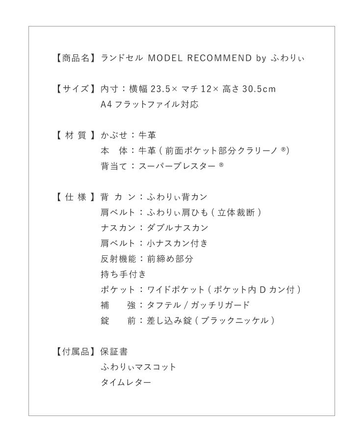 ランドセル MODEL RECOMMEND by ふわりぃ 牛革使用 日本製 6年保証 男の子 女の子 高級感 A4フラットファイル対応 大容量 プレゼント 2020年 型落ち【送料無料】