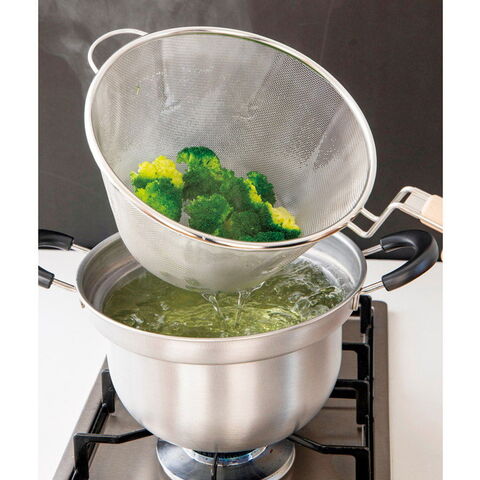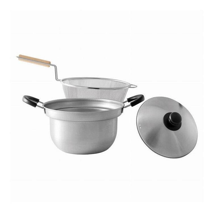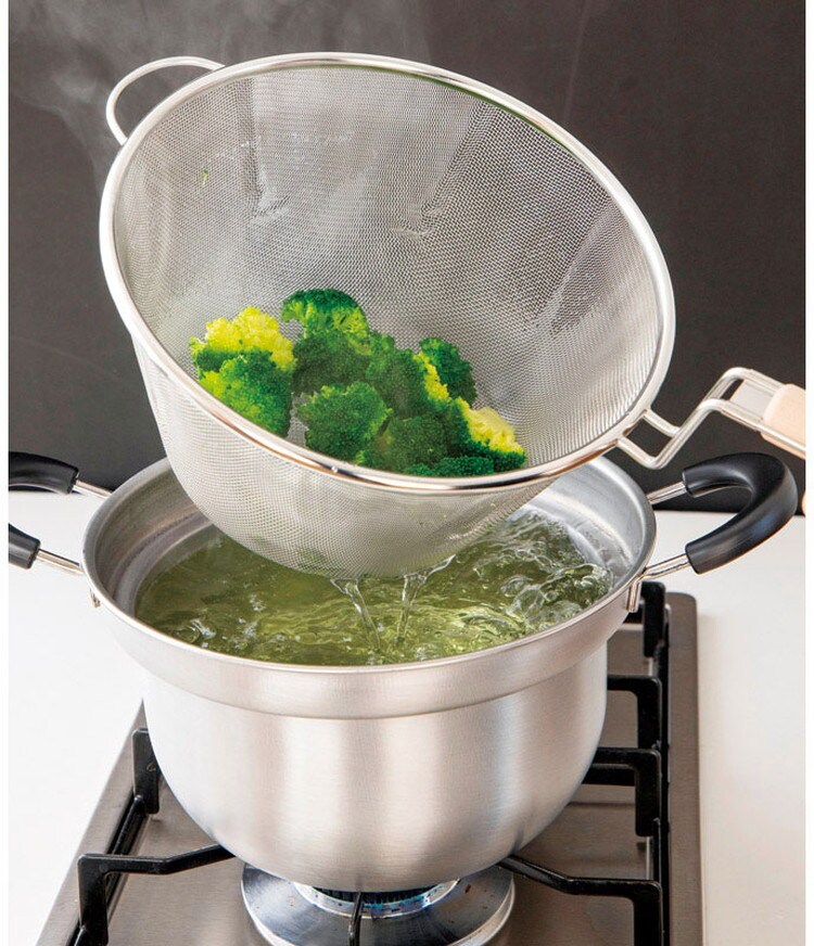 熱回りのいいステンレスの両手鍋に、握りやすい木柄付きのザルがセットされています。鍋にザルを入れた状態で茹でれば、タイミングを逃すことなく引き上げることができます。また、鍋本来の機能も秀逸です。本体上部につけた段と曲線を描く構造の合せ技で吹きこぼれにくく、煮物などにも重宝すること間違いありません。