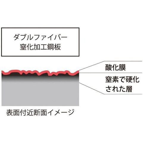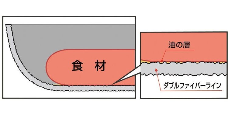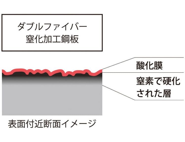 両面に繊維状の凹凸を浮き立たせ、鉄の表面を窒素で硬化させる「窒化加工」を施したフライパン。より高い耐腐食性と耐摩耗性を持っています。